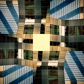 verspiegelte Scheiben des Volksbankgebäudes in Freiburg im Breisgau