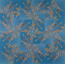 Mit Reif überzogene Birkenzweige mit den Blütenwürstchen in einem Garten in Pforzen im Allgäu
